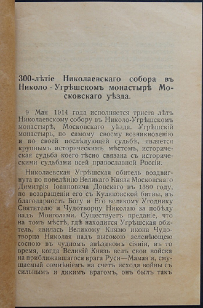 Книга "1614-1914. В память 300-летия Николаевского собора в Николо-Угрешском монастыре" посвящена истории Никола-Угрешского монастыря и его главной святыни - Николаевскому собору. Книга была издана в 1914 году, во время празднования 300-летнего юбилея собора.