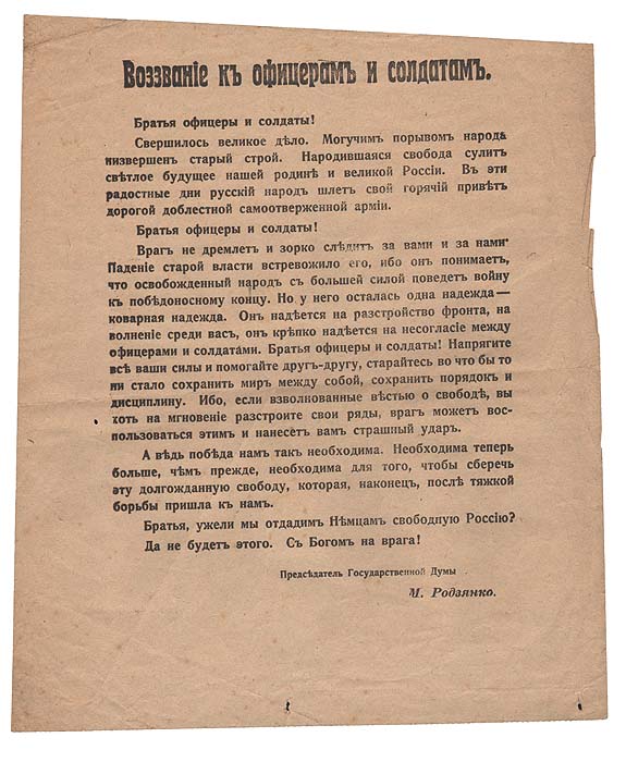 Агитационный листок "Воззвание к офицерам и солдатам"