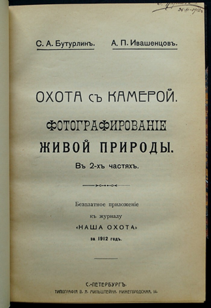 Бутурлин С.А., Ивашенцов А.П. Охота с камерой. Фотографирование живой природы. Фотографические приборы и процессы для воспроизведения жи