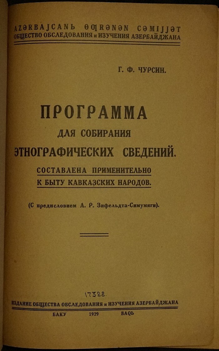 Чурсин Г.Ф. Программа для собирания этнографических сведений кавказских народов.