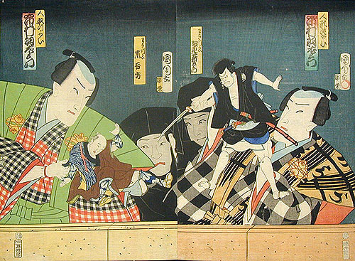 Диптих. Кукольный театр с куклами-самураями. Цветная гравюра (XIX век), Япония