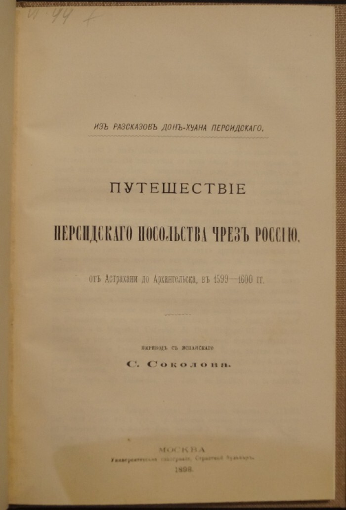 Дон-Хуан Персидский Орудж-бек Баят. Путешествие персидского посольства через Россию от Астрахани до Архангельска, в 15991600 гг.
