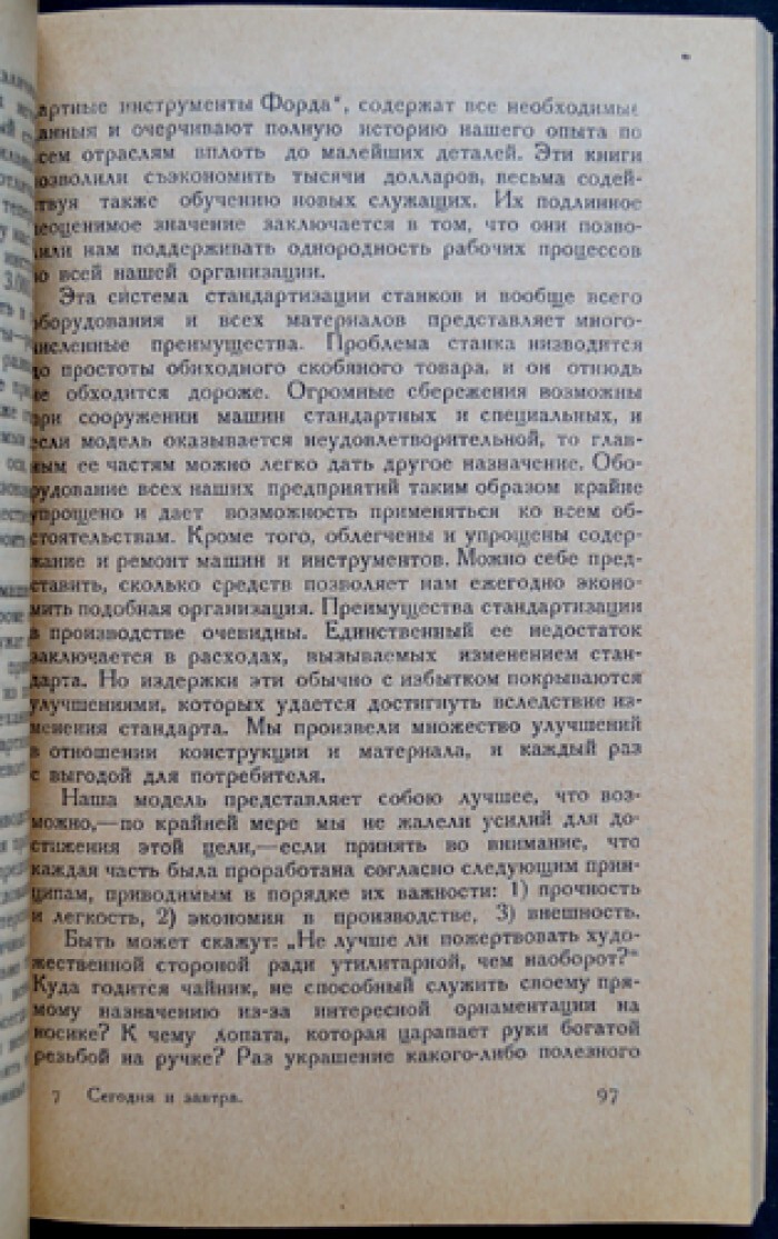 Форд подробно описывает свою систему производства автомобилей, которая стала известной как "фордизм". Он объясняет, как его команда инженеров и рабочих смогла сделать производство автомобилей более эффективным и доступным для массового потребителя.
