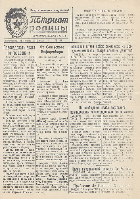 Газета "Патриот Родины". 21 августа 1944 года, № 296