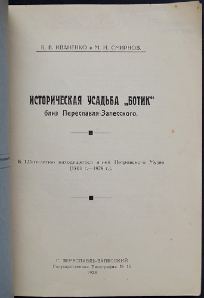 Иваненко Б.В., Смирнов М.И. Историческая усадьба Ботик близ Переславля-Залесского.