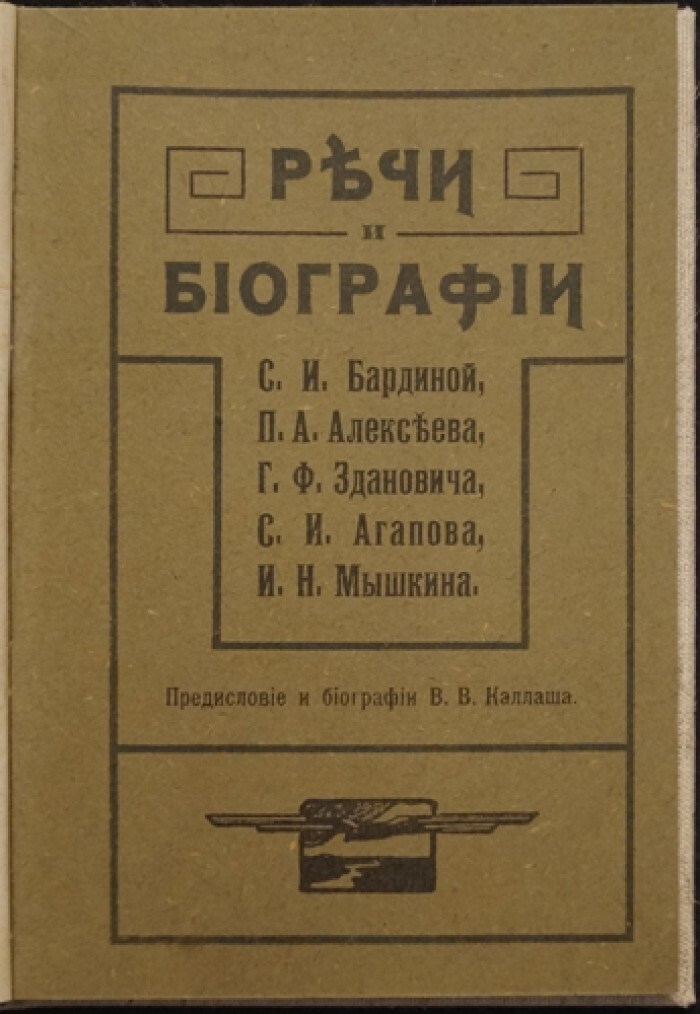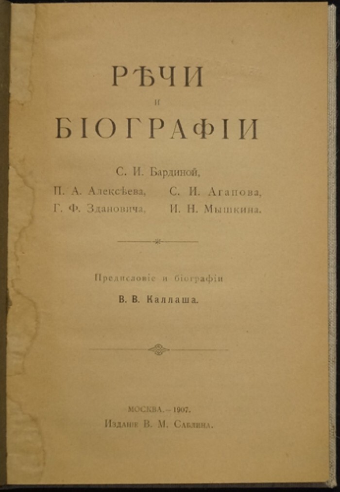 Каллаш В. А. Речи и биографии С. А. Бардиной, П. А. Алексеева, Г. Ф. Здановича, С. И. Агапова, И. Н. Мышкина.