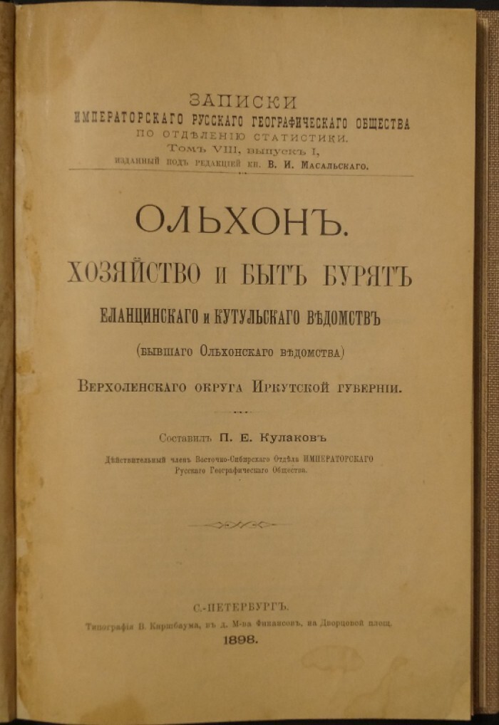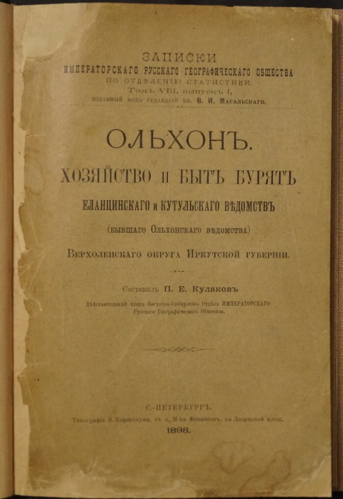 Кулаков П.Е. Ольхон. Хозяйство и быт бурят Еланцинского и Кутульского ведомств (бывшего Ольхонского ведомства) Верхоленского округа Ирк