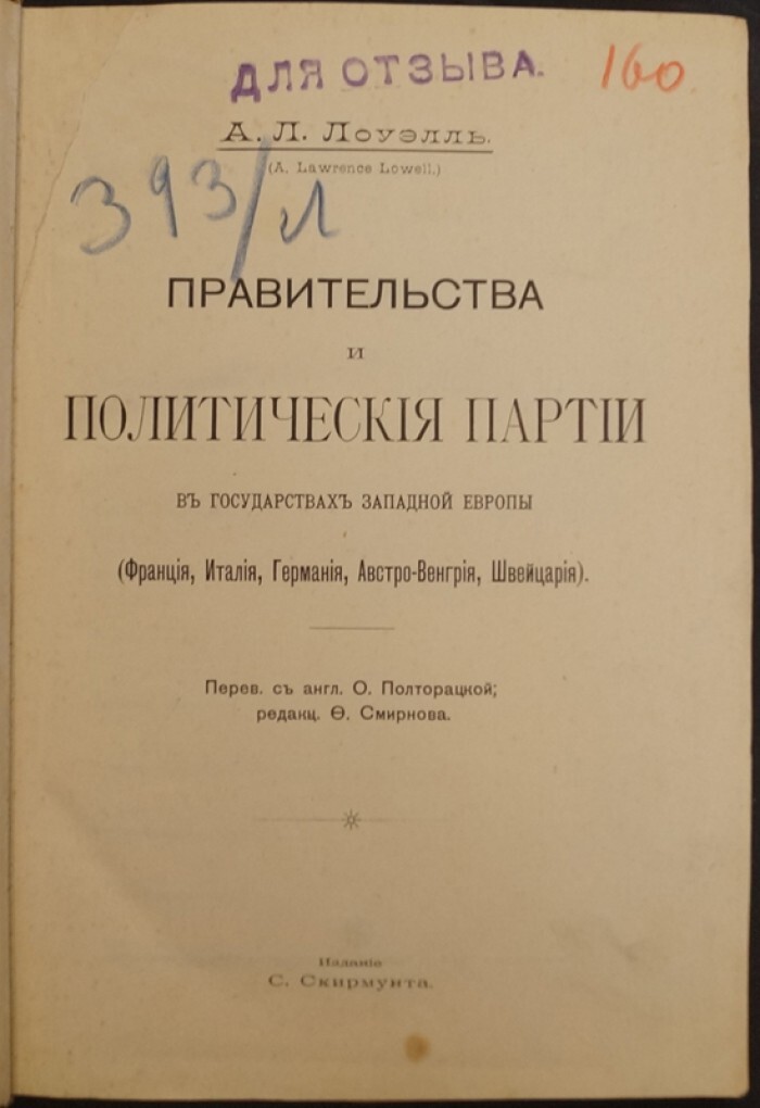 Лоуэлль А.Л. Правительства и политические партии в государствах Западной Европы (Франция, Италия, Германия, Австро-Венгрия, Швейцария)