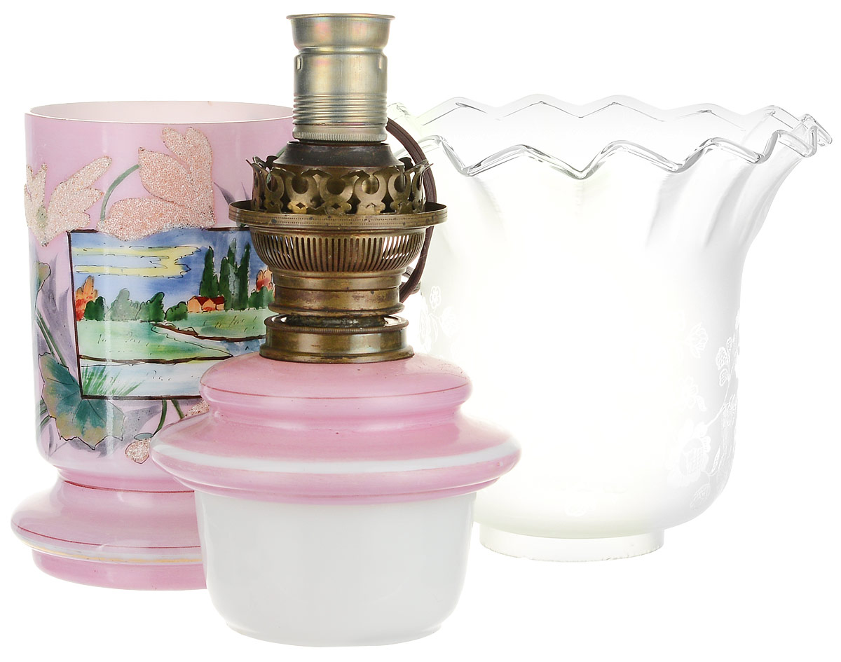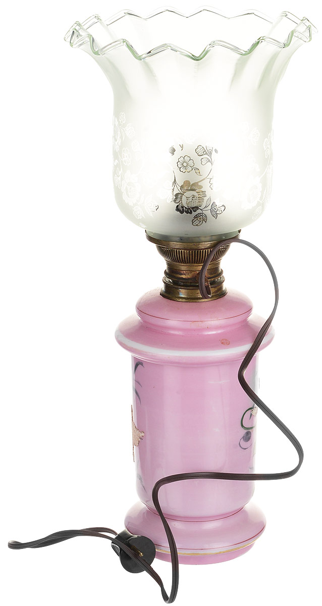 Настольная лампа (переделка из керосиновой) с оригинальным плафоном. Металл, стекло, роспись эмалевыми красками, обсыпка. Западная Европ