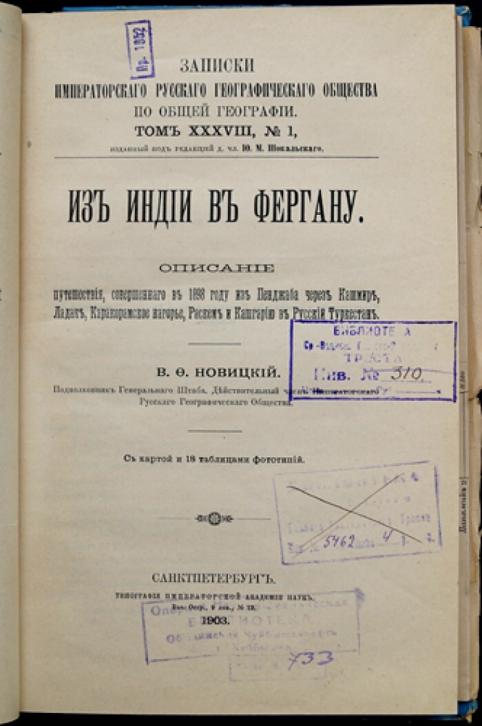 Новицкий В.Ф. Из Индии в Фергану. Описание путешествия, совершенного в 1898 году из Пенджаба через Кашмир, Ладак, Каракорамское нагорье, Рас