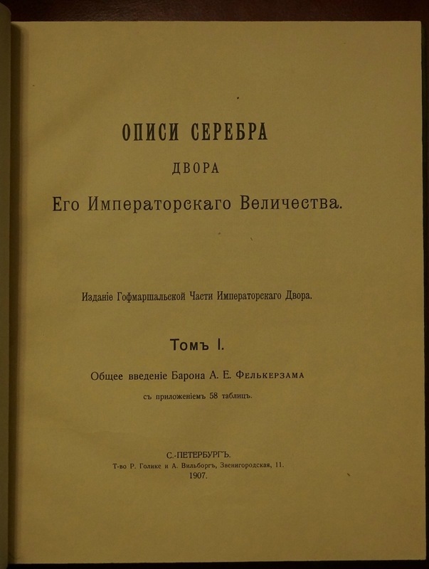 Описи серебра Двора Его Императорского Величества. В двух томах: Том I: Общее введение Барона А.Е. Фелькерзама. С приложением 58 таблиц. То