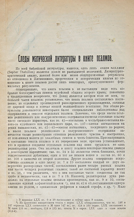 Автор анализирует структуру псалмов, их язык и символику, исследуя, какие элементы магической литературы могут присутствовать в этой книге. Он рассматривает различные аспекты магической практики, такие как заклинания, амулеты, обряды и ритуалы, и анализирует, какие из них могут быть обнаружены в текстах псалмов.