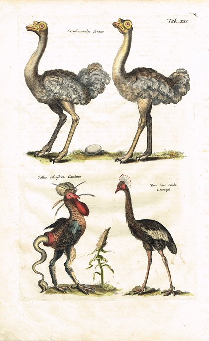 Страусы, василиск и венценосный журавль. Серия "Бестиарий Мериана". Лист № 21. Маттеус Мериан. Гравюра на меди, акварель. Голландия, Амстер