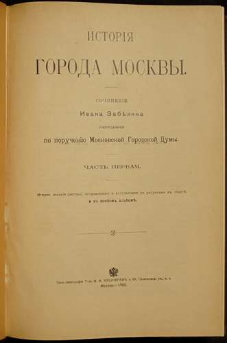 Забелин Иван. История города Москвы. Часть первая. (Единственная). 1905 г. XXVI, 652 стр. + Забелин Иван. История города Москвы. Альбом Старинных В
