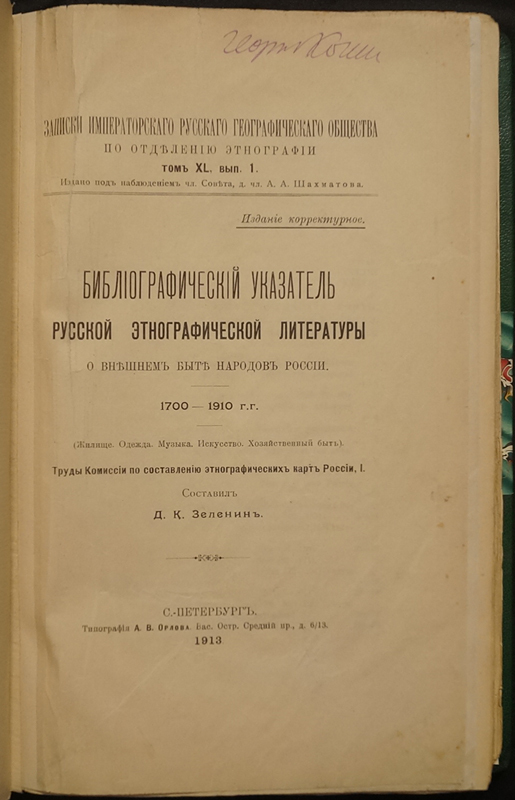 Зеленин Д.К. Библиографический указатель русской этнографической литературы о внешнем быте народов России. 17001910 гг. (Жилище. Одежда. Муз
